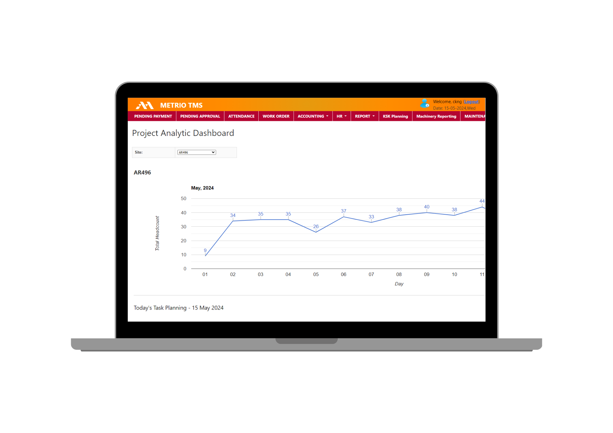 Web-based system to facilitate attendance tracking, task management, machinery reporting, and performance analysis.